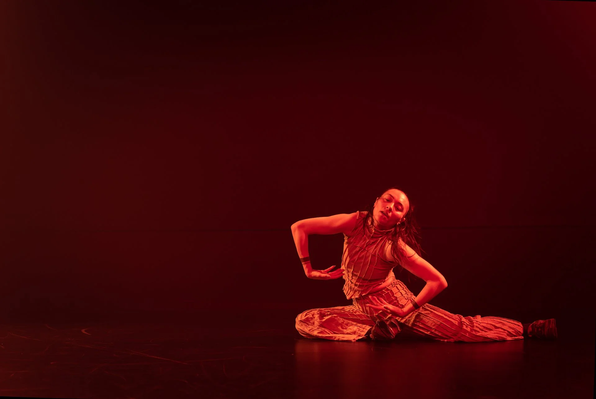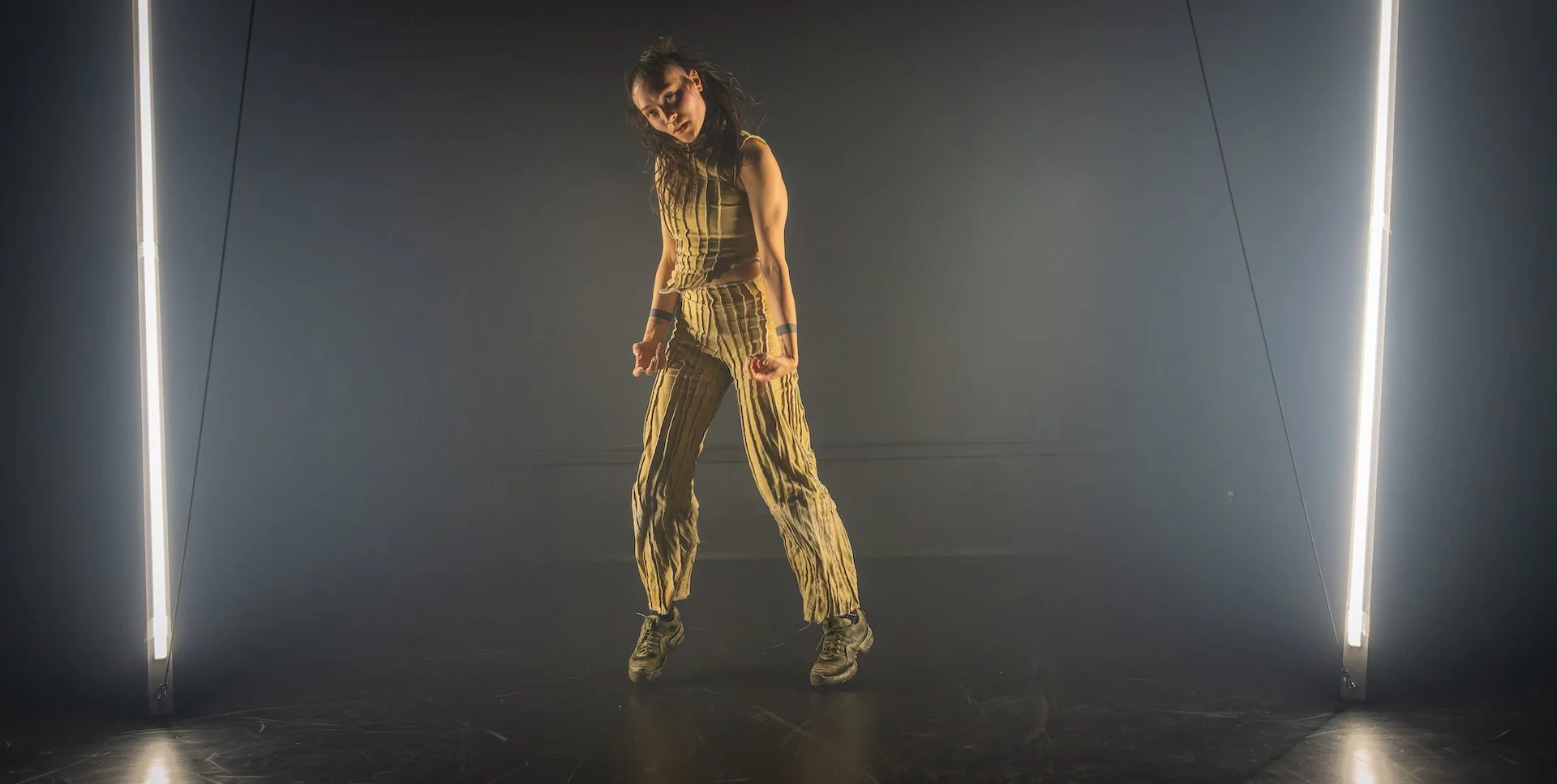 On an empty stage, between pools of light, their body appears. Sounds which shift between the digital, vocal, and the organic. Repetitions of movements, switching from intense sensuality to grotesqueness, almost alien. Everything is spare, essential, like the ribbed garments they are wearing, in which they pass for a warrior, or a shaman.