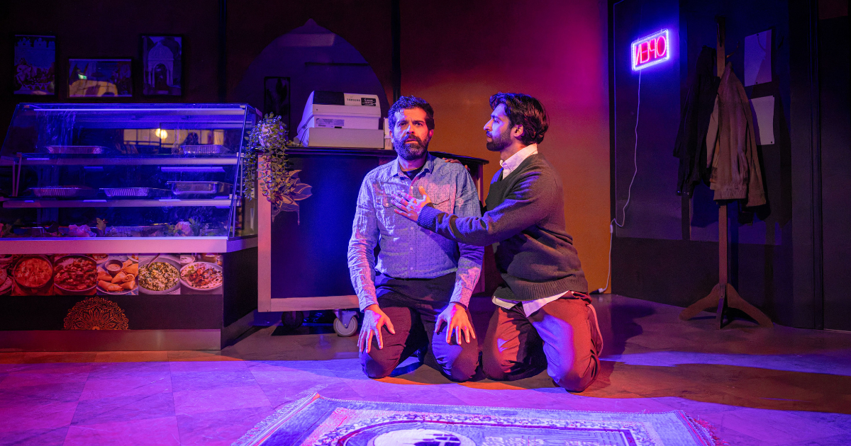 Diana Uribe’s set design, the Mughlai Moon restaurant, is a powerful element of the production. Purples and oranges cover the walls, pointed archways over the doors, with accents of gold scattered throughout the space, including lighting fixtures hanging from the ceiling, occasionally casting beautiful shadow patterns on the walls. The set was completed by a counter with a cash register, a (very clean) food display case, and a single table with two chairs Stage Left. Frosted windows flanked the front door of the establishment, intended to allow ambient light into the space, although this ended up mostly ineffectual. In fact, while the set held its own, the technical execution faltered; the lighting (Jordana Natale) and sound design (Rehan Lalani) had the distinct feeling of a high school theatre production, complete with jarring lighting shifts, poorly mixed music, and abrupt sound cues. This could have been incredibly detrimental, however, Uribe’s design brought the Indian restaurant to life, and gave the three characters an authentic space to tell their stories.