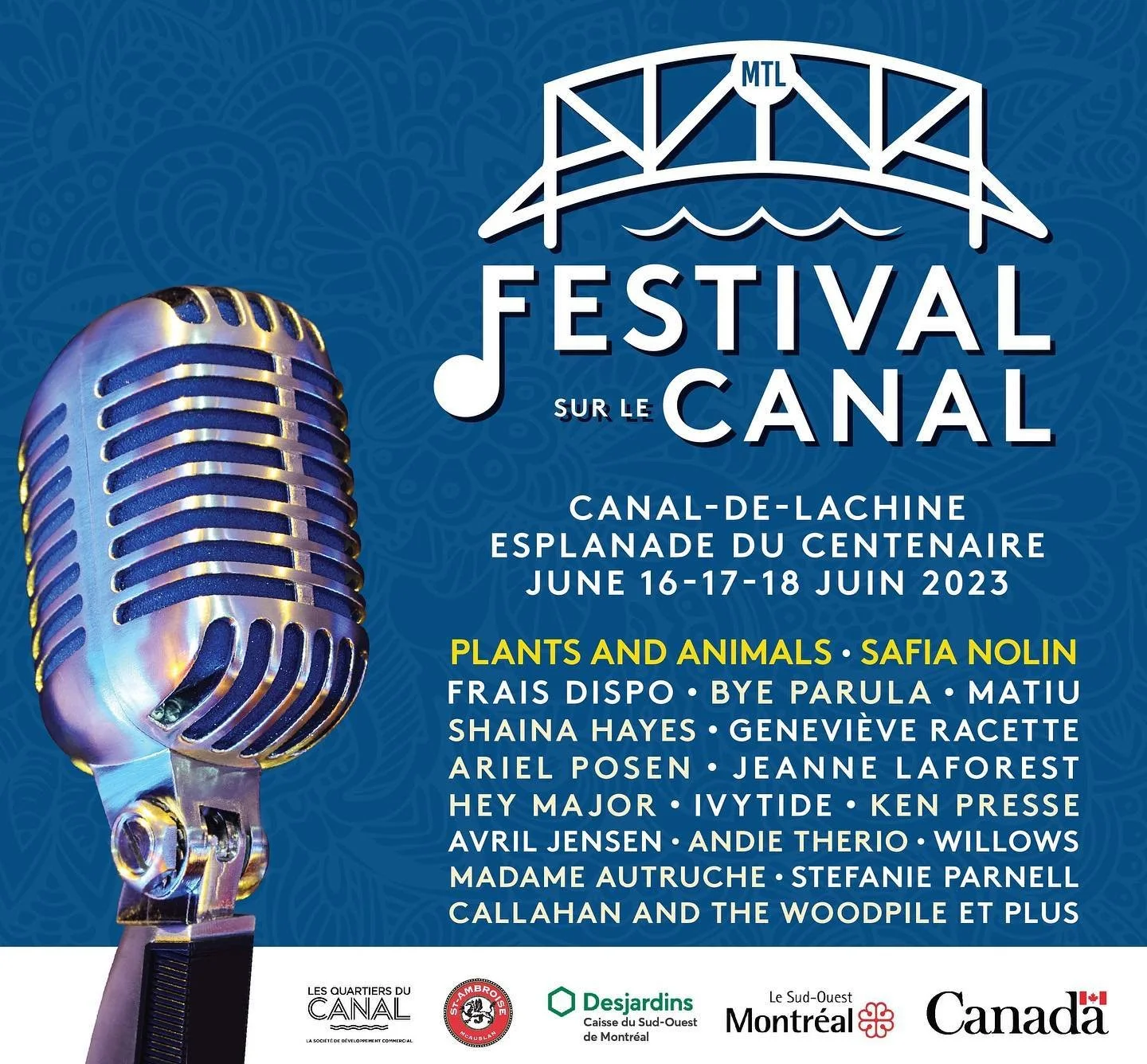 It may not be blocking off any streets, but there is a major three day festival in the Sud-Ouest this weekend. It’s on the Lachine Canal, in fact, it’s called Festival sur le Canal. The event runs tonight, tomorrow, and Sunday. All the headliners, and most of the acts booked, are local Montreal bands or performers, with some from elsewhere in Quebec. It takes place at the Esplanade du Centenaire beside the Lachine Canal in St-Henri. If you’re wondering where that is, it’s the same spot where FolkFest used to take place. In fact, the staging is the same: free entrance, donations accepted, a paid VIP area, and affordable beer and booze (please don’t sneak your own in, support your local events). Not sure if this current fest is simply the former one with different musical styles welcome and different branding, or if this is a completely new animal. While I may not get to call it a “folk-ing good time”, it does look like fun. (Editor’s Note: That was funny.) Check out the schedule and other info: https://festivalsurlecanal.com/en/