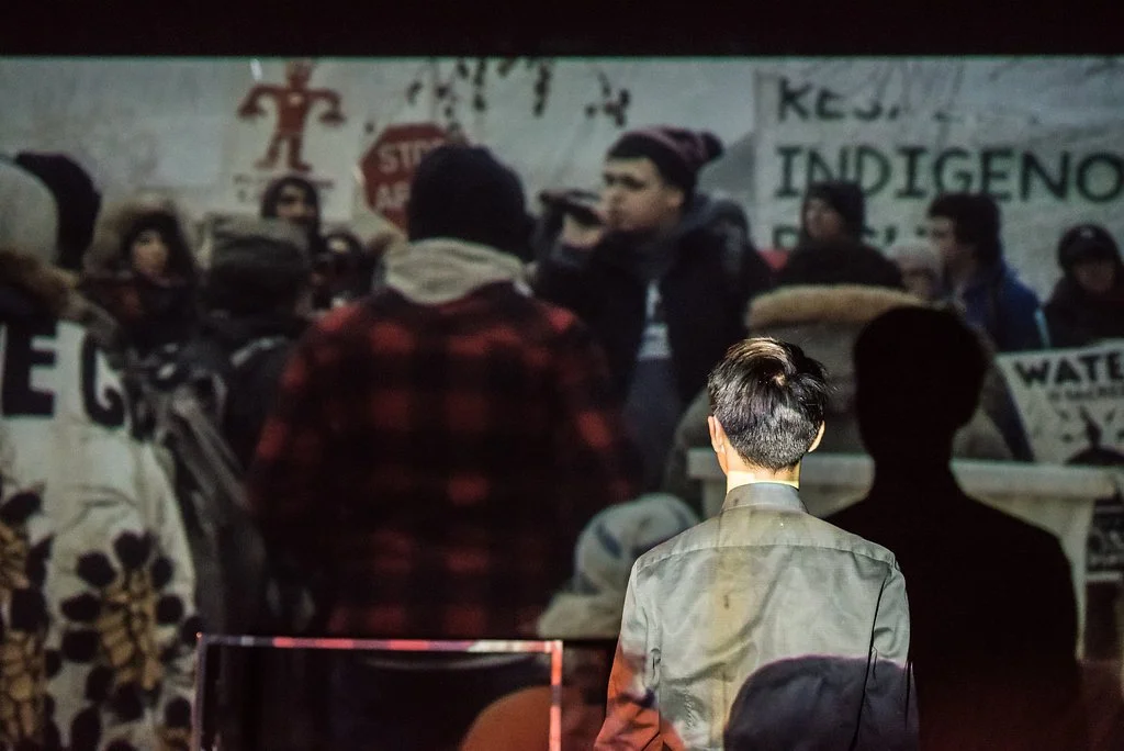 It’s with this goal of understanding that Kevin Matthew Wong then introduces us to the two people that were the catalyst for the piece we’re currently experiencing: Vanessa Gray and Beze Gray, sibling activists from the Aamjiwnaang First Nation. It’s here where the story is taken from “lecture theatre” into something more intimate, more personal. From the siblings, we hear first-hand accounts of life on the reserve. We see photos, videos, and hear anecdotes about growing up in Chemical Valley. The multimedia is a patchwork of television clips, and Wong’s own recordings, covering the span of the show’s inception and creation. Serving as advisors and dramaturgs for the production, we learn about the siblings’ work as land defenders and water protectors, their temporary shut down of Enbridge Energy’s infamous “Line 9”, and their subsequent court case for this activism. A necessary epilogue outlines the sibling’s current projects, and how we can involve ourselves.