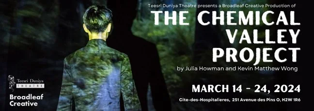 As Rahul Varma, Artistic Director of Teesri Duniya Theatre, stood centre stage and welcomed us to their new performance space, Rangshala Studio, located in Cité-des-Hospitalières on des Pins Ouest, I felt a brief moment of hope wash over me. Performance spaces, particularly new performance spaces, are few and far between in Montreal, a dire situation growing worse each day. After the warm welcome, Varma went on to speak about the numerous genocides currently being perpetrated around the world. “One day, the survivors will come to us and ask us what we were doing when it was happening,” he explained, “and we’re going to have to answer them. And if we say, we were creating theatre, we will have to defend that. Did we make meaningful theatre?” The message was clear, and on-brand for Rahul Varma and the Teesri Duniya Theatre Company, who’s website reads “Change the world, one play at a time” in large, bold letters on their homepage. It is this motivation, this objective, behind Teesri Duniya’s presentation of Broadleaf Creative’s The Chemical Valley Project.
