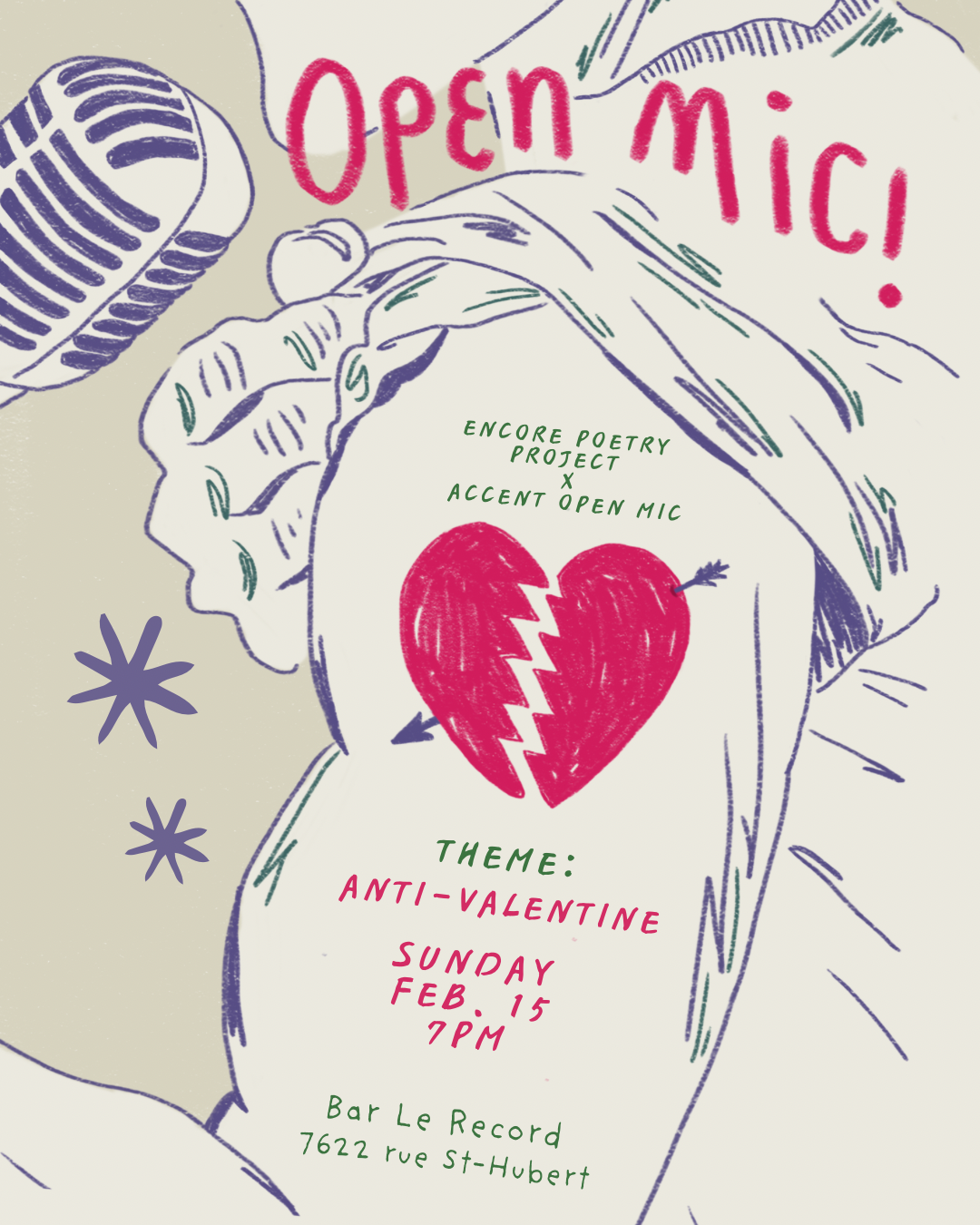 Though Encore Poetry has changed over the years, it continues to bring the community together to bear witness to the beauty and rawness of poetry. The project remains accessible to all art lovers, offering free or pay-what-you-can tickets for their open-mic events. Keep an eye out on their socials for updates, upcoming events like poetry trivia, and to meet the amazing team behind such an incredible endeavour. They’re excited to see and hear you on anti-Valentines.