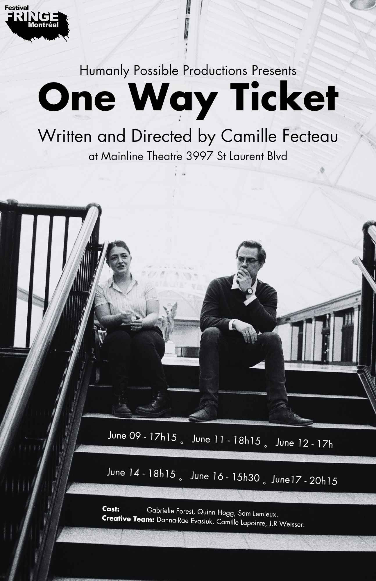 The action of the text book-ends the body of it, beginning with the panic of the two souls realizing that they have died, which eventually calms to a crestfallen acceptance, ending with the actual conflict of the play promised in the copy promoting the show on the Fringe Website; that one single ticket onto the imminent train that leads back to the land of the living can be taken by one of these well-meaning people with the rest of their lives ahead of them. The main middle section of the play features very long monologues performed with the pace of people with all the time in the universe to unfold themselves to each other. While this makes for very three-dimensional characterization, and some beautiful moments for Lemieux and Forest to exhibit acting skills, it does drag. Perhaps this valley of energy serves the setting of purgatory for the audience's experience. It's only near the end that the conductor acknowledges the two souls and announces that the train back to the living world arrives in 5 minutes. The power of a ticking time bomb in a one-act play would have been more compelling were it revealed at the outset, or shared with the characters in the first section. Then their expositional speeches recounting their lives would have been charged with the urgency of the will to live, or reveal a disenchantment with the drudgery of their mortal existence, but clear motivations would have breathed more life into these dead people.