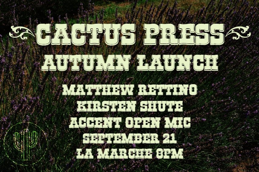 Accent Open Mic presents Cactus Press' Fall title launch with featured readers Matthew Rettino and Kirsten Shute. Sign up for the open mic at the door!