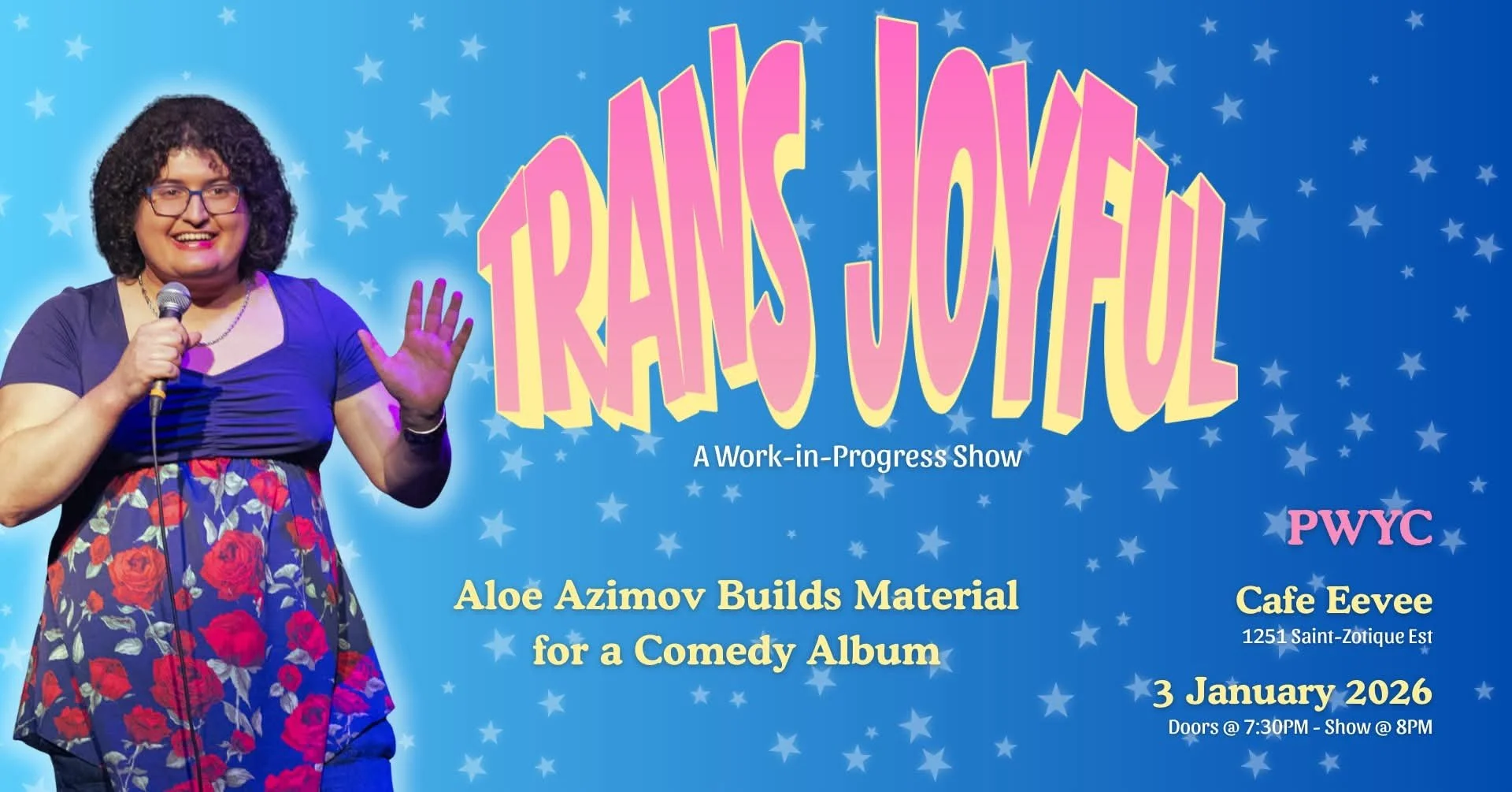 Trans Joyful A Work in Progress show is exactly what it sounds like. Comedian Aloe Azimov builds material for their comedy album, and performs a 30 minute set in this show alongside incredibly talented comedians!!!