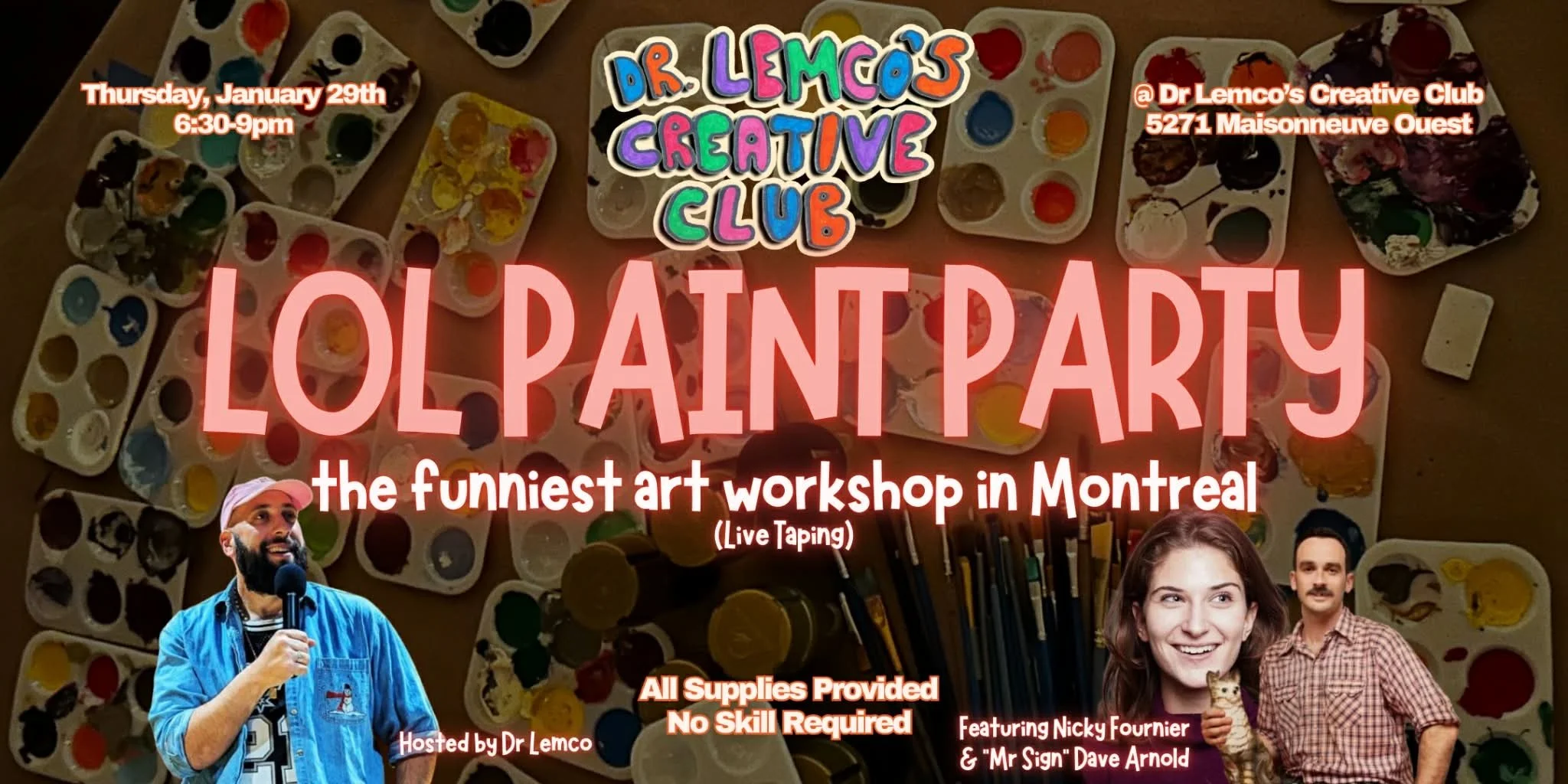 Turn your funniest story into art at The LOL Paint Party; a creative, laughter-filled night with Dr. Lemco’s Creative Club! Featuring Nicky Fournier, and “Mr. Sign” Dave Arnold. No experience needed, just a desire to experiment and play. All materials will be provided.
