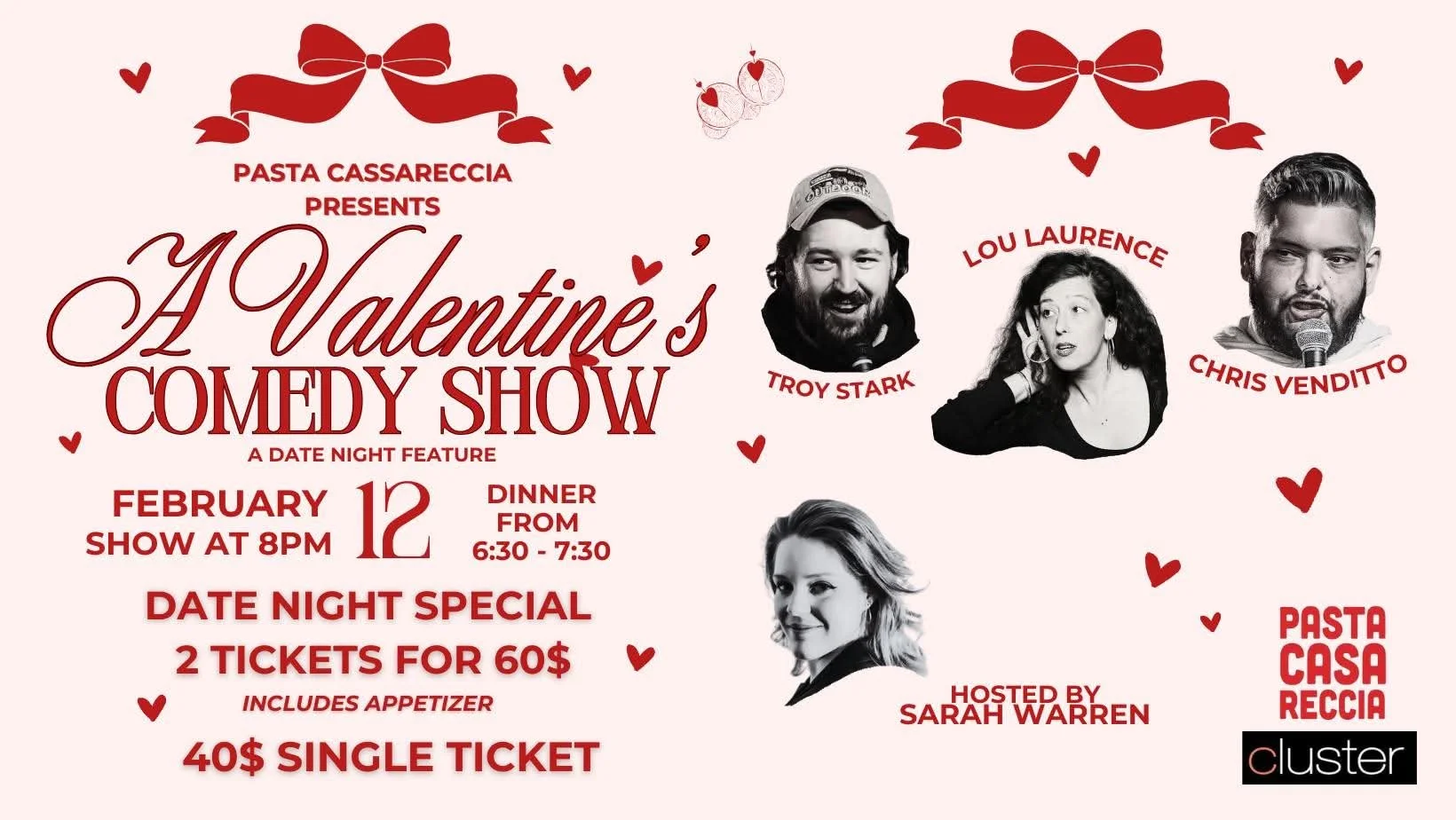 Nothing says romance like laughter, and this Valentine’s season, we’re serving up both. Join us at the beloved Pasta Cassareccia for an unforgettable night of comedy, comfort food, and cozy vibes.