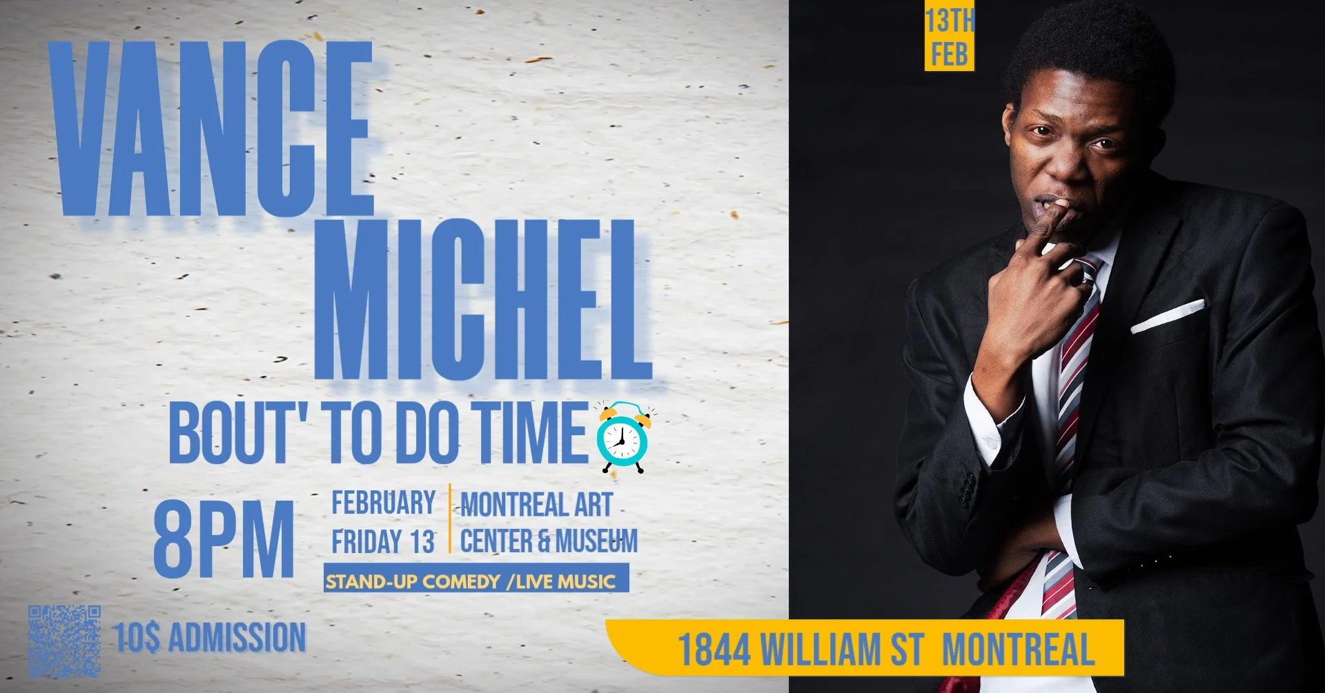 Vance Michel is a Montreal-born, American-raised comedian now based in Montreal, where he co-hosts the World’s Smallest Comedy Night. A seasoned performer, Vance has appeared on the Nubian Show presented by Kenny Robinson in Toronto, as well as Kill Tony, and JFL / Zoofest.