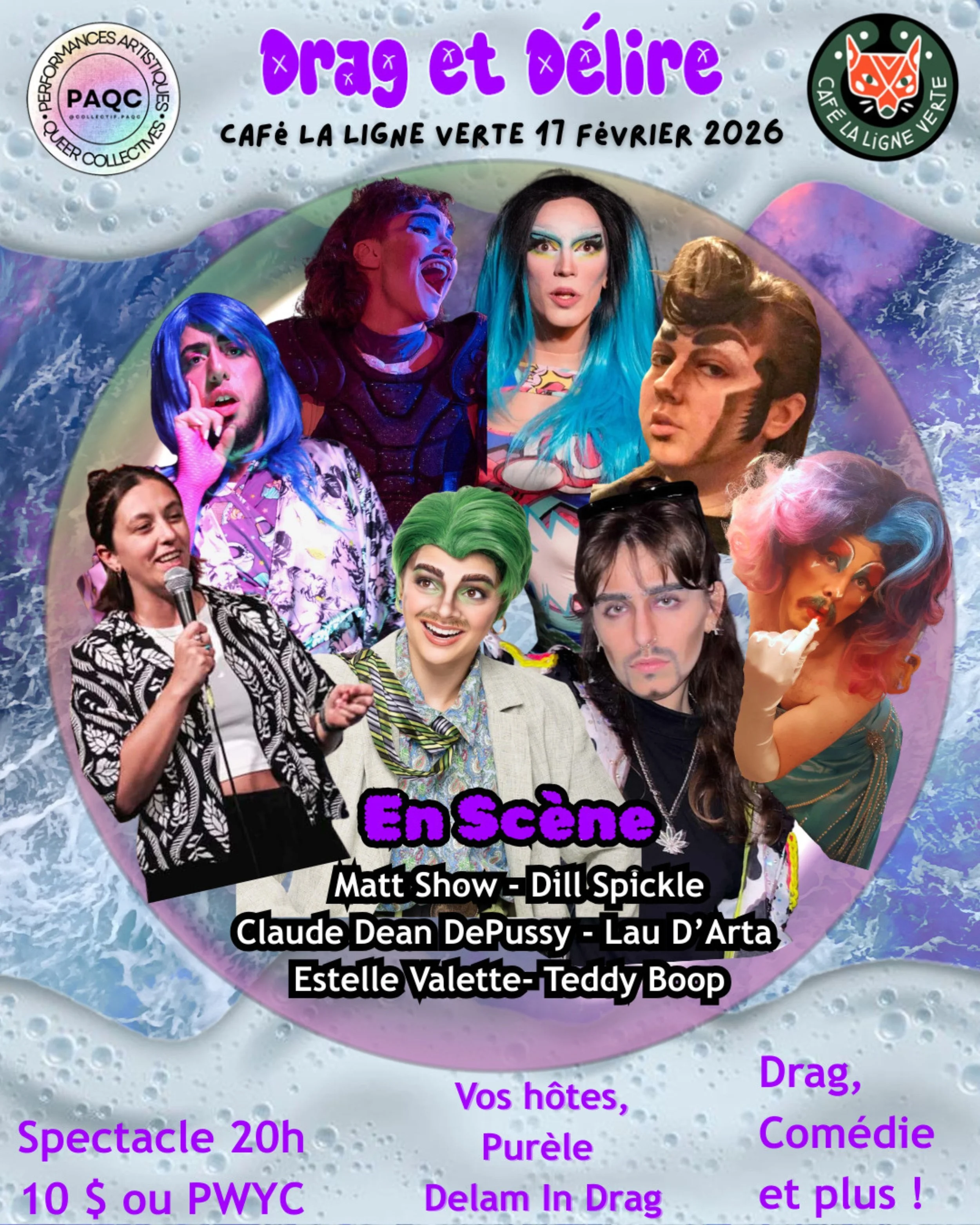 Featuring Purèle, Delam in Drag, Teddy Boop, Dill Spickle, Lau D’Arta, Claude DePussy, Estelle Valette, and Angeline.