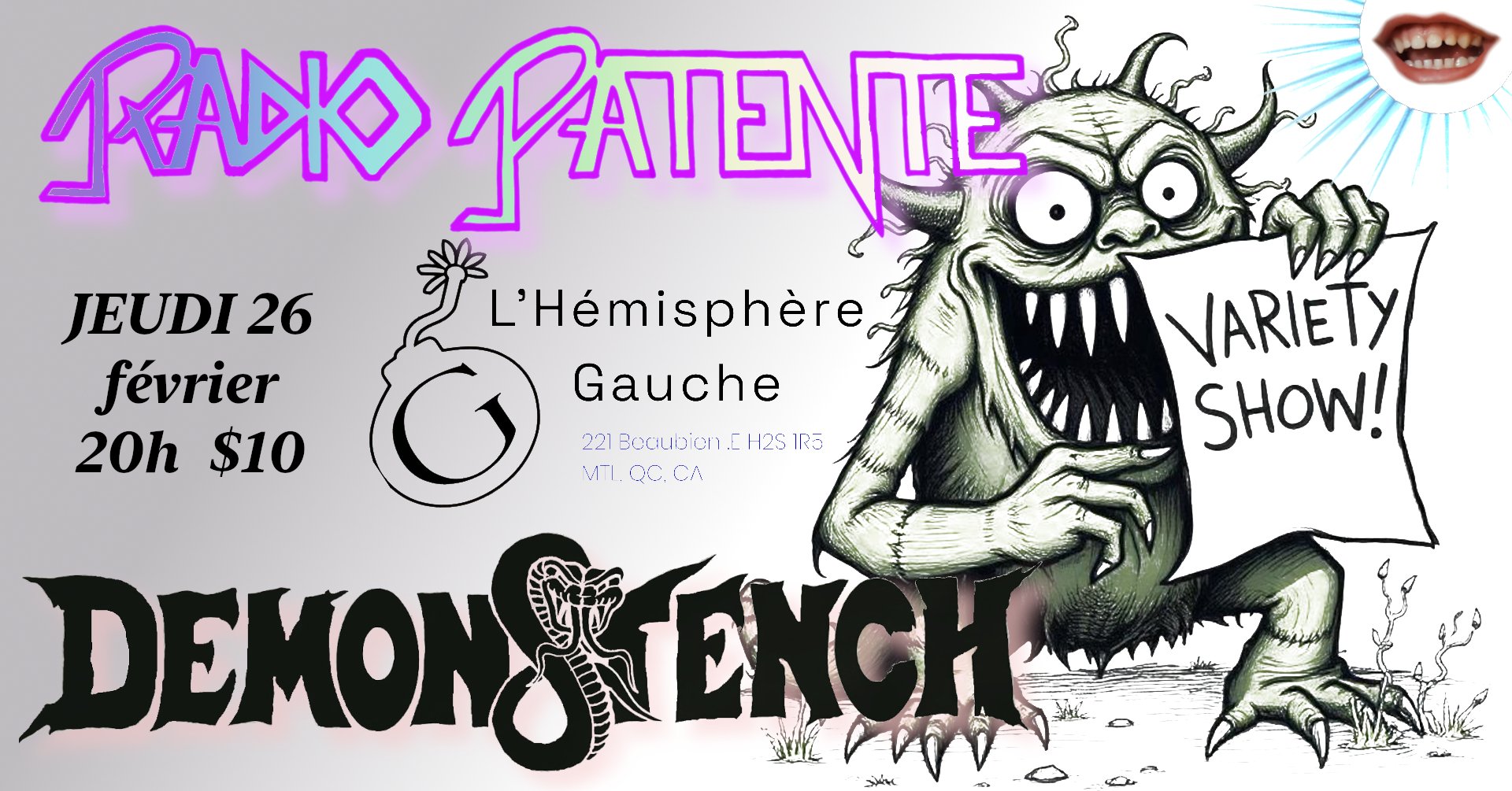 Radio Patente starts the night in style before throwing it to the powerhouse quartet of destruction, Demonstench. Lace up your shit kickers, ‘cuz this is gonna rock.