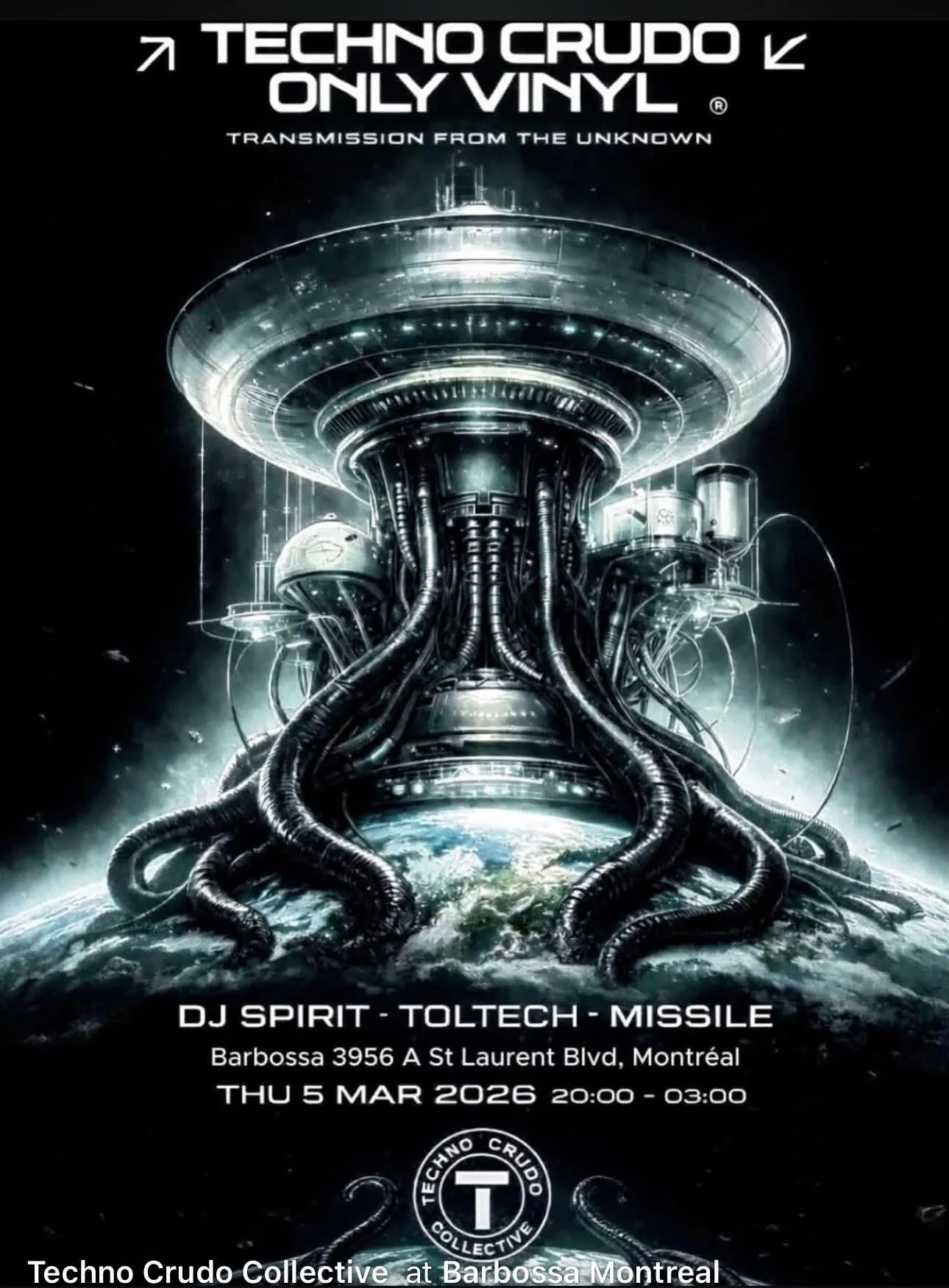Joining Toltech is his Vinyl Syndicat partner, Missile. A Mexico City native now based in Montréal, Missile is a purist who performs exclusively on vinyl. As the founder of the Vinyl Syndicat label and booking agency, he is a key architect in the city’s analog resurgence, pushing strictly limited-run wax. Missile is the driving force behind the Montréal chapter of "In Techno We Trust," a global event series connecting techno hubs worldwide. After a thunderous debut in September featuring Detroit Techno Militia’s T. Linder, the momentum continues this April for In Techno We Trust 2.0. This upcoming massive collaboration features international heavyweights Tensal (Spain) and Israel Toledo (Germany). This night offers an intimate look at the hypnotic, high-energy vinyl selection that defines his movement.