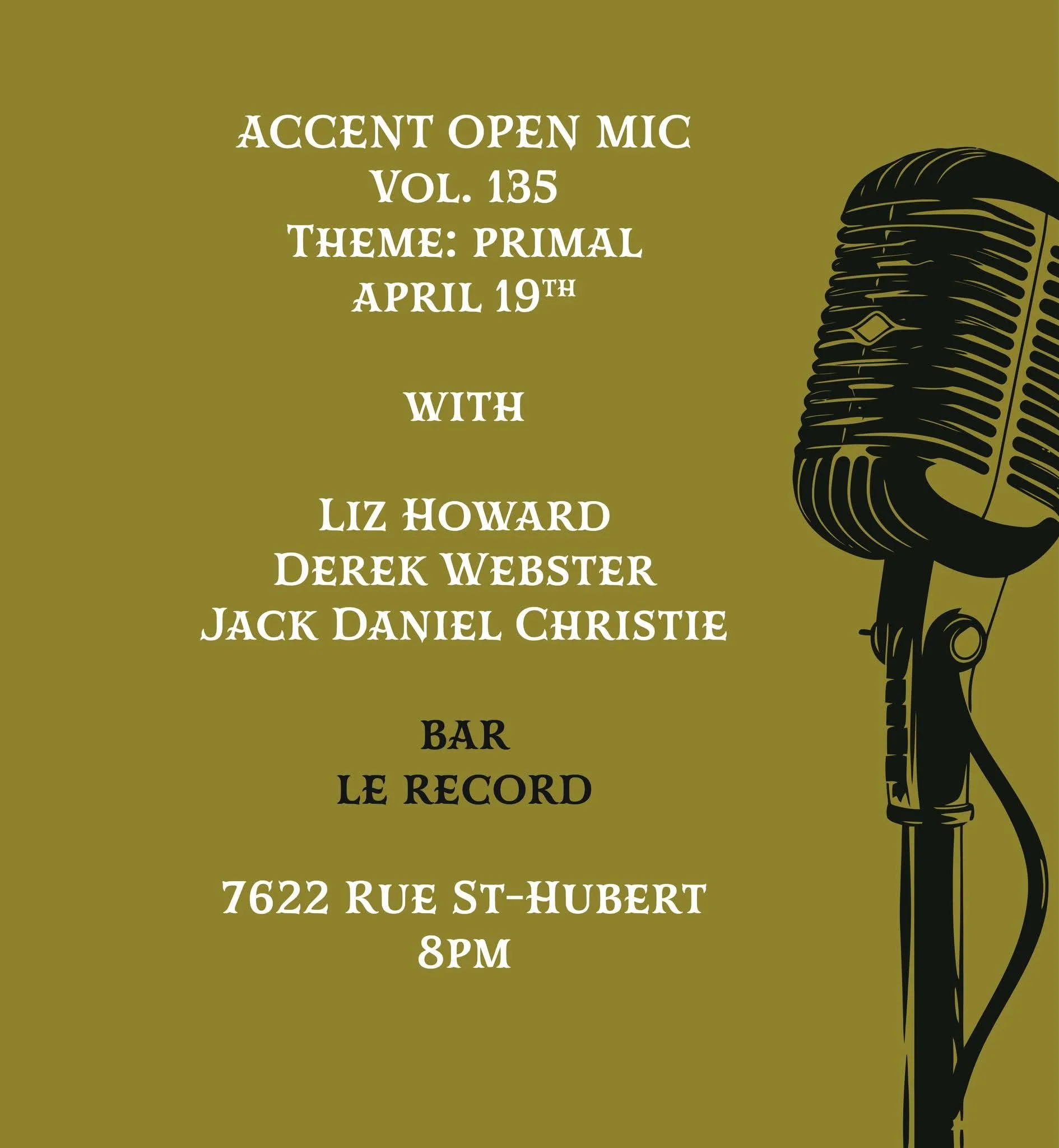 Join Accent at the ever faithful Bar Le Record on St. Hubert for another evening of poetry and prose hijinks featuring guest readings by Liz Howard, Derek Webster, and Jack Daniel Christie. As always, sign up for the open mic at the door!