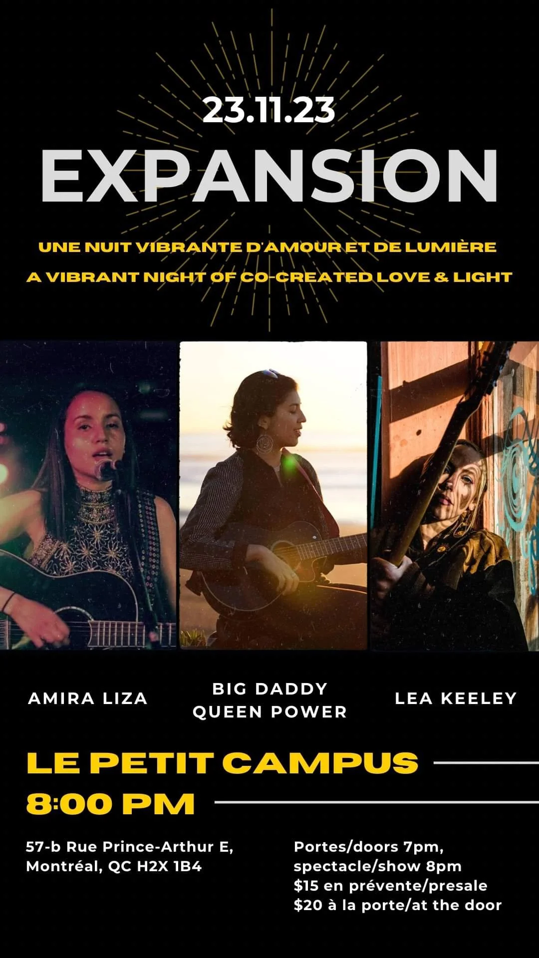 Lea Keeley is a singer-songwriter whose soul-stirring performances enchant and captivate her audience. What sets her apart is the remarkable strength of her voice, which exudes the passion and fiery soul akin to legendary artists like Aretha Franklin and Stevie Wonder. In her solo shows, she skillfully employs a loop pedal to craft rich harmonies, and catchy melodies to transport her listeners to a different realm. Keeley’s songwriting delves deep into profound themes, exploring the cosmic duality of existence, the importance of self-love, and the power of Mother Nature. Beyond her musical artistry, Keeley has made a lasting impact on her community by founding her own open mic at Parc Jeanne Mance during the pandemic. She created a safe space for artists to freely express themselves in a time where genuine human connection was desperately needed. In doing so, Keeley has emerged as a driving force in the local artistic scene, being a guiding light for others to follow their passion, while unifying and exemplifying the incredible power of music, and vulnerable human connection.