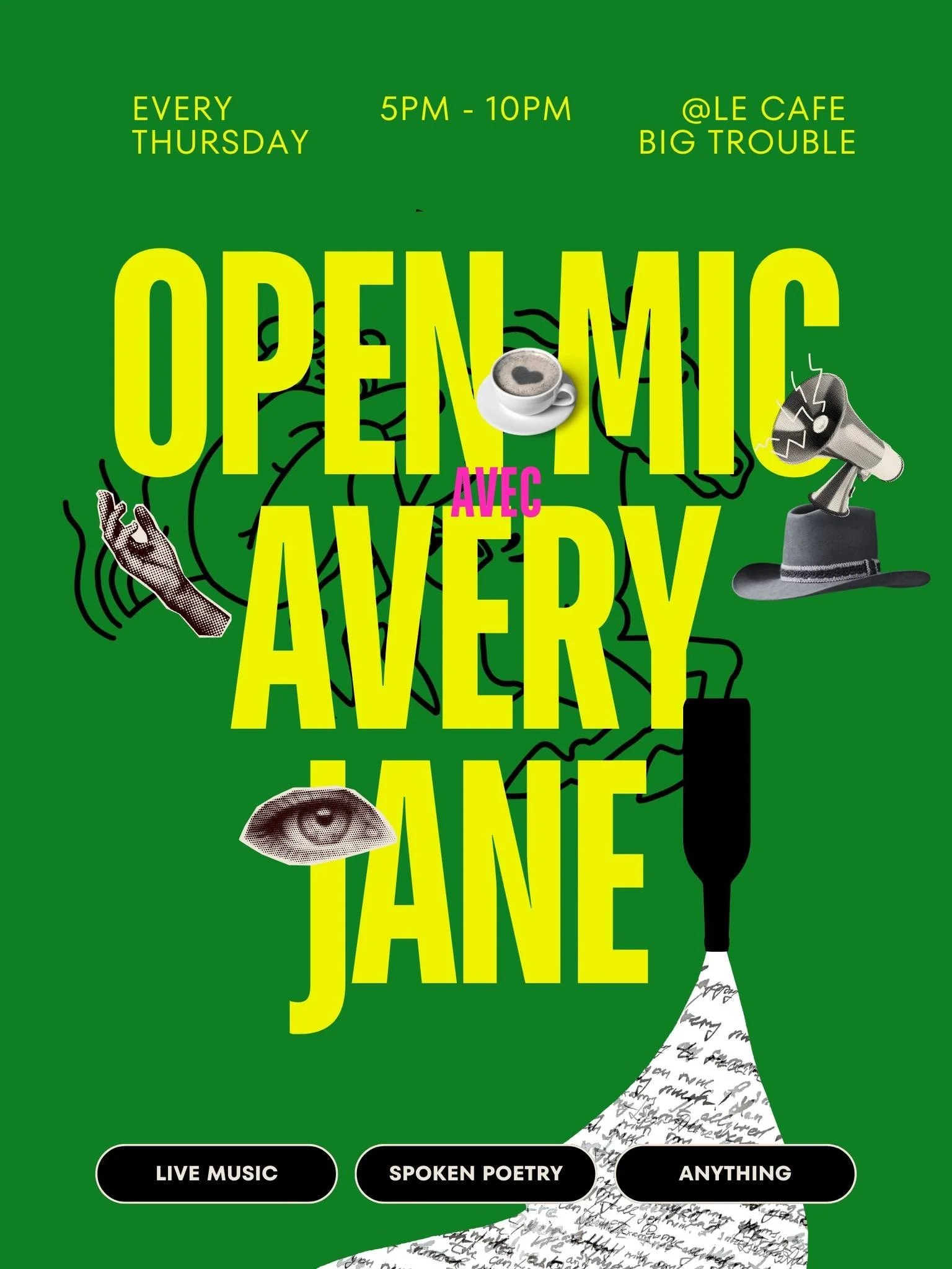 Every Thursday evening at Cafe Big Trouble, the talented Avery Jane hosts an open mic! They have coffee, cocktails and snacks. Bring your poetry, your lyrics, your instruments and your friends!