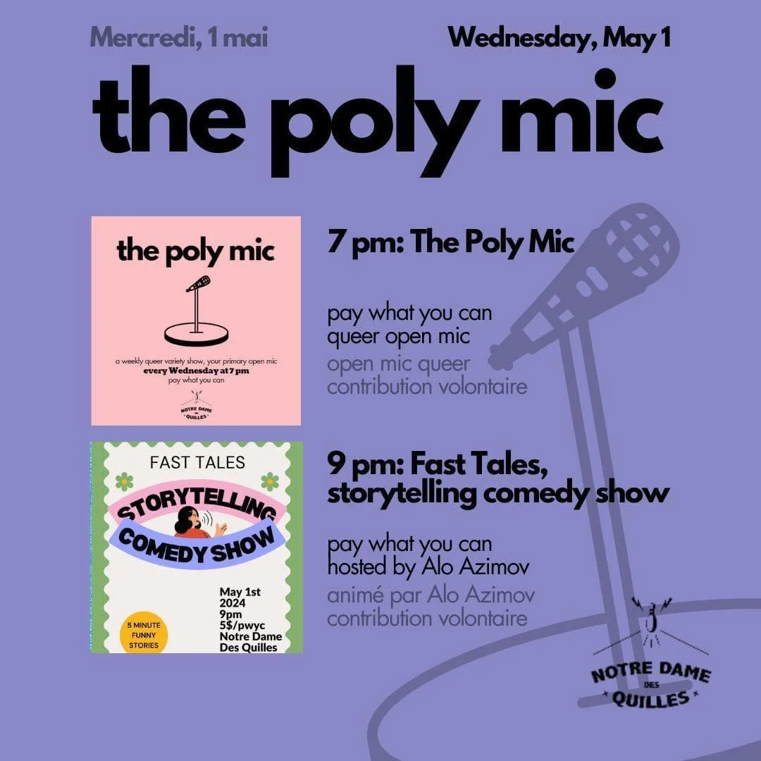 Tonight Raquel Maestre hosts a great edition of The Poly Mic, a queer open mic! After 9pm Alo Azimov hosts Fast Tales, a fun queer comedy storytelling hour!!! Both at Notre Dame Des Quilles and both PWYC!