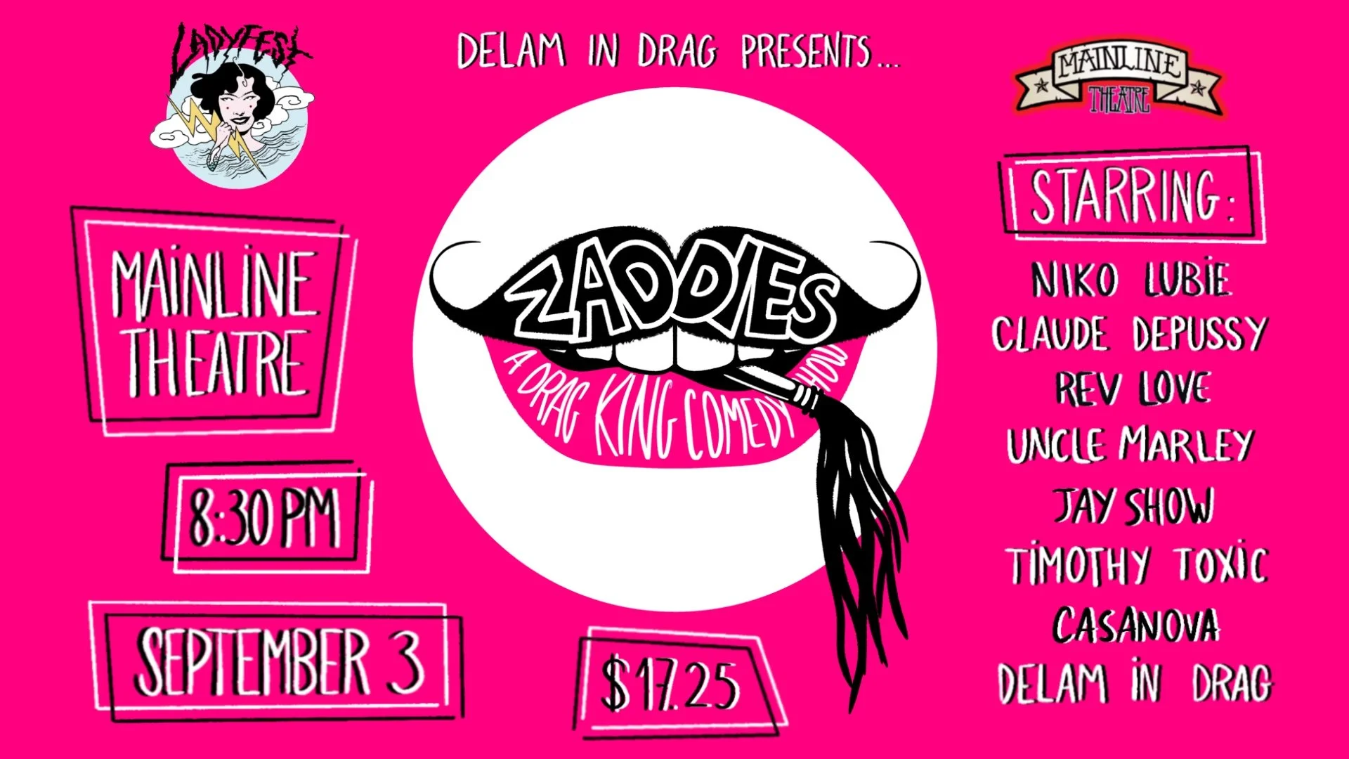 Zaddies, A Drag King Comedy Show, is an alternative and inclusive drag show produced by Delam In Drag. Zaddies is witty and funny, with a diverse cast dismantling toxic masculinity, breaking the binary, and eradicating patriarchy! Our safe space policy ensures a welcoming environment for all attendees: no discrimination or hostile behavior will be tolerated.