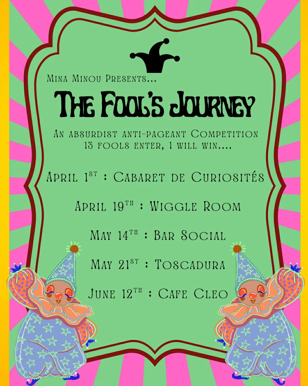 Mina Minou: It’s a five show competition that is inspired by anti pageants, absurdity, and the fool tarot card, which is all about adventure and trying things. Essentially, I'm going to have 13 participants whose applications were all randomly selected by a name generator. I did have some spots specifically reserved for racialized people, but other than that it was a random generator. Each show will have a different little challenge for them that they're not going to know about until the end of the previous challenge. The first show comprises a “short and sweet”, so they have two and a half minutes to do something of their choosing. The following challenge is then revealed at the end of each show. Each show is a fundraiser outside of show expenses, so my tech, my kitten, my photographer, and sometimes venue fees are calculated. Other than that, all ticket sales will be going to whatever charity organization the eliminated contestant from each show chooses. Everybody who participates gets something out of it, whether they win or lose.
