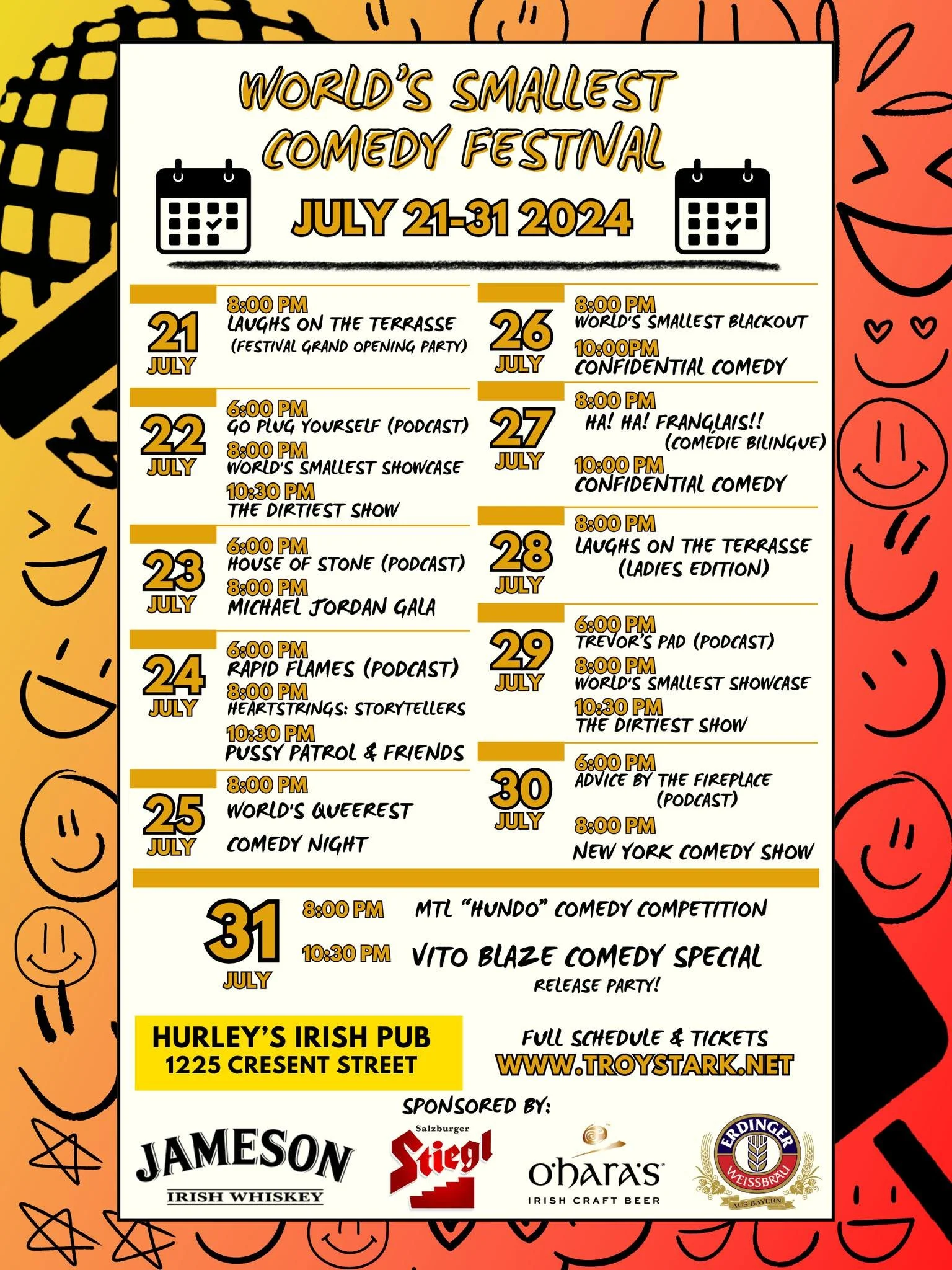 Did I miss anything?! Probably. Imma need you to check the schedule, and plan accordingly. Like I said before, World's Smallest Comedy Night is basically a Montreal institution at this point. They keep getting bigger and badder, even as other mics fall off. And why? Because The World's Smallest Crew is dedicated to the craft of comedy. All shows range between $10 - $20, which is a helluva deal. We all need the laughs, so grab ‘em while you can. Score a seat, and start a new comedy tradition.
